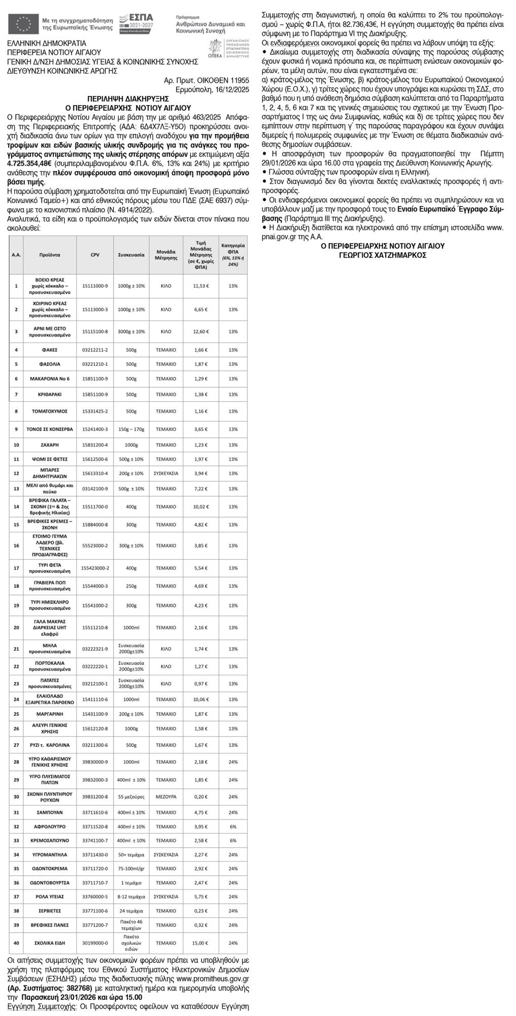 Προμήθεια τροφίμων και ειδών βασικής υλικής συνδρομής για τις ανάγκες του προγράμματος αντιμετώπισης της υλικής στέρησης απόρων, από την Περιφέρεια Ν. Αιγαίου