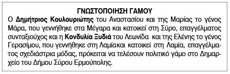 Γνωστοποίηση γάμου για Κουλουριώτη Δημήτριο και Κονδυλία Ξυδιά Κείμενο Βλέπε εικόνα. Αριθμός Φύλλου: Αριθμός Φύλλου 6755 Κατηγορία: Κατηγορία Γνωστοποίηση Γάμου