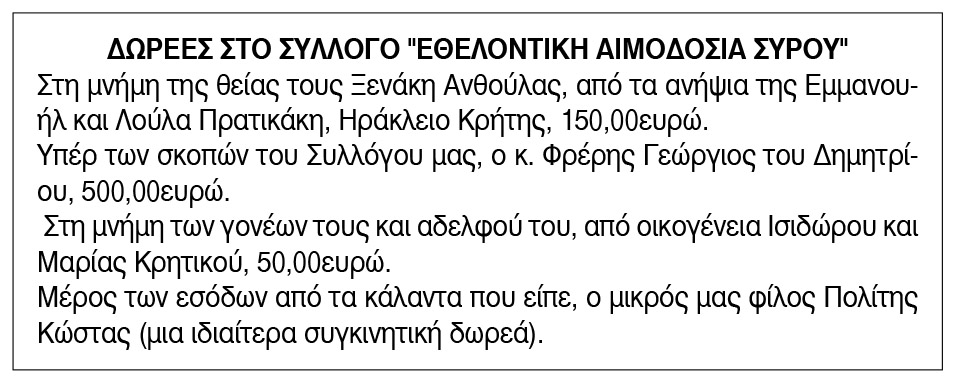 Ευχαριστήριο για δωρεές από το Σύλλογο Εθελοντική Αιμοδοσίας Σύρου Κείμενο Βλέπε εικόνα. Αριθμός Φύλλου: Αριθμός Φύλλου 6756 Κατηγορία: Κατηγορία Δωρεές