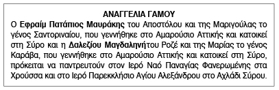 Αναγγελία γάμου για Εφραίμ Πατάπιο Μαυράκη και Δαλεζίου Μαγδαληνή Κείμενο Βλέπε εικόνα. Αριθμός Φύλλου: Αριθμός Φύλλου 6764 Κατηγορία: Κατηγορία Αναγγελία Γάμου