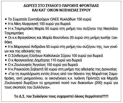 Ευχαριστήριο για δωρεές από το Σύλλογο Κατ' Οίκον Νοσηλείας Σύρου Κείμενο Βλέπε εικόνα. Αριθμός Φύλλου: Αριθμός Φύλλου 6764 Κατηγορία: Κατηγορία Δωρεές