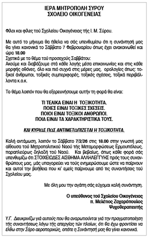 Ανακοίνωση Σχολείου Οικογένειας Μητροπόλεως Σύρου, Φεβρουαρίου Κείμενο Βλέπε εικόνα. Αριθμός Φύλλου: Αριθμός Φύλλου 6782 Κατηγορία: Κατηγορία Πρόσκληση