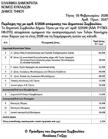 Αναπροσαρμογή των Τελών Κοινόχρηστων Χώρων για το έτος 2026, από το Δήμο Τήνου Κείμενο Βλέπε εικόνα. Αριθμός Φύλλου: Αριθμός Φύλλου 6782 Κατηγορία: Κατηγορία Απόφαση