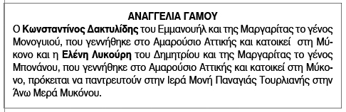 Αναγγελία γάμου για Δακτυλίδη Κωνσταντίνο και Ελένη Λυκούρη Κείμενο Βλέπε εικόνα. Αριθμός Φύλλου: Αριθμός Φύλλου 6793 Κατηγορία: Κατηγορία Αναγγελία Γάμου