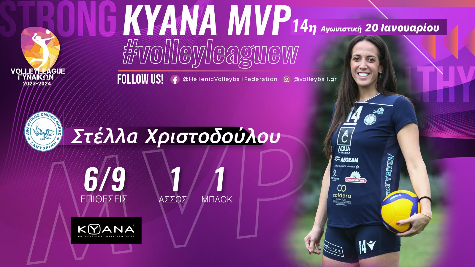 Η Στέλλα Χριστοδούλου του ΑΟ Θήρας είναι η MVP της 14ης αγωνιστικής του πρωταθλήματος της Volley League Γυναικών. Η έμπειρη πασαδόρος ήταν η κορυφα...
