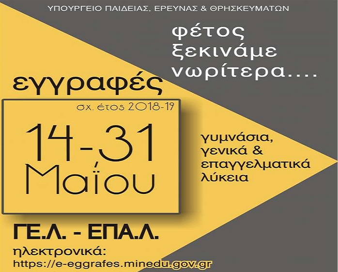 Από τις 14 Μαΐου και ώρα 10:00 έως τις 31 Μαΐου 2018 και ώρα 14:00 θα μπορούν οι μαθητές/τριες που επιθυμούν να εγγραφούν, να ανανεώσουν την εγγραφή τ...