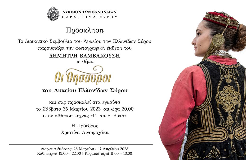Τα εγκαίνια της έκθεσης ΄Θησαυροί του Λυκείου Ελληνίδων Σύρου ΄΄ Με την Φωτογραφική ματιά του Δημήτρη Βαμβακούση θα πραγματοποιηθούν το Σάββατο 25 Μαρ...