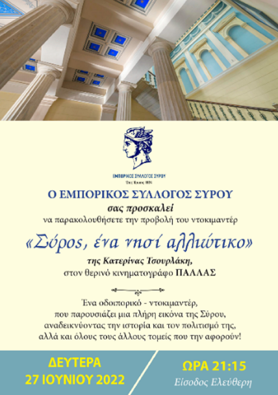Ένα εξαιρετικό ντοκιμαντέρ με τίτλο "ΣΥΡΟΣ, ΕΝΑ ΝΗΣΙ ΑΛΛΙΩΤΙΚΟ", σε σκηνοθεσία Κατερίνας Τσουρλάκη, θα προβληθεί στον θερινό κινηματογράφο "ΠΑΛΛΑΣ", τ...