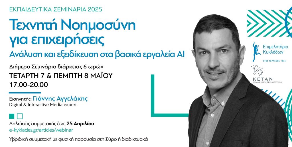 Μετά από τη μεγάλη ανταπόκριση που είχε το ενημερωτικό σεμινάριο σχετικά με τις εξελίξεις στην Τεχνητή Νοημοσύνη, το Επιμελητήριο Κυκλάδων, ανταποκριν...