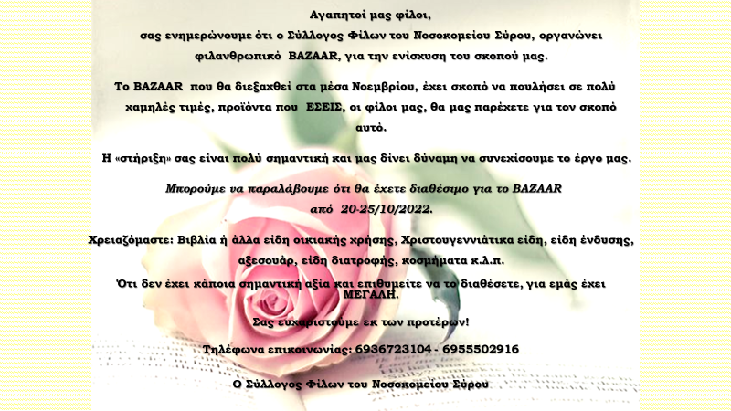 Σας ενημερώνουμε ότι ο Σύλλογος Φίλων του Νοσοκομείου Σύρου, οργανώνει φιλανθρωπικό BAZAAR, για την ενίσχυση του σκοπού μας. Το BAZAAR που θα διεξα...