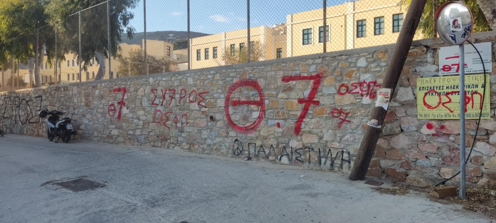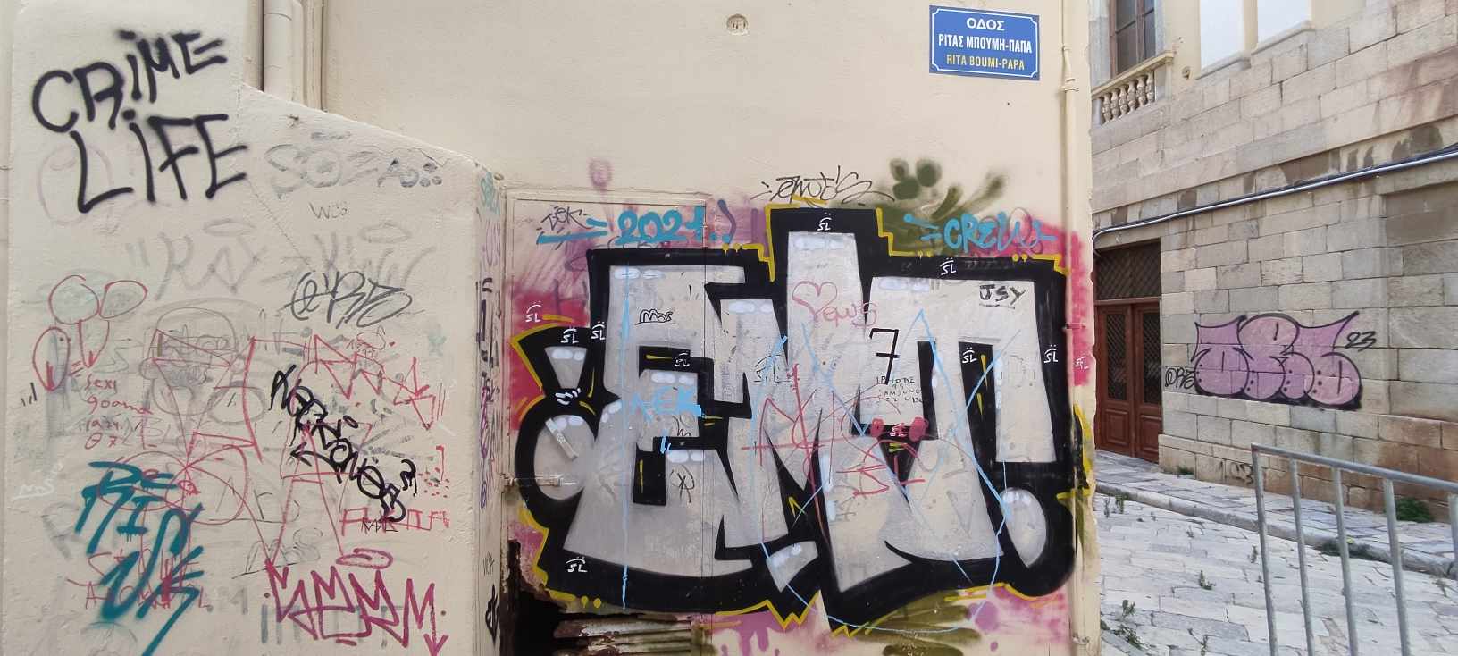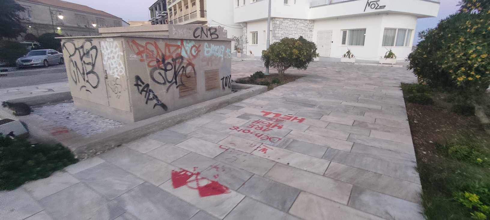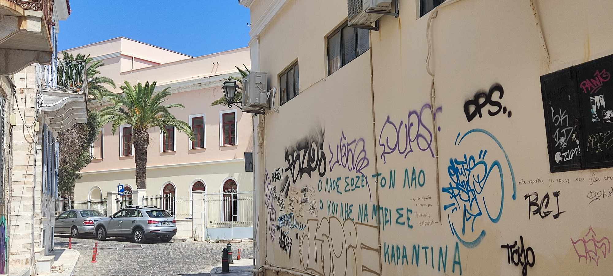 Συνεχίζεται ο κύκλος καταστροφών και αισθητικής υποβάθμισης της Ερμούπολης και του ιστορικού κέντρου, αφού σε διάφορα κτήρια, νέα συνθήματα και γκράφι...