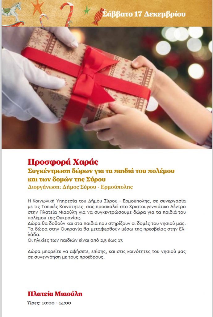 Σας περιμένουμε το Σάββατο 17 Δεκεμβρίου 2022 στο Χριστουγεννιάτικο Δέντρο μας στην πλατεία Μιαούλη από τις 10.00 έως τις 14.00, όπου θα συλλέγουμε Δ...