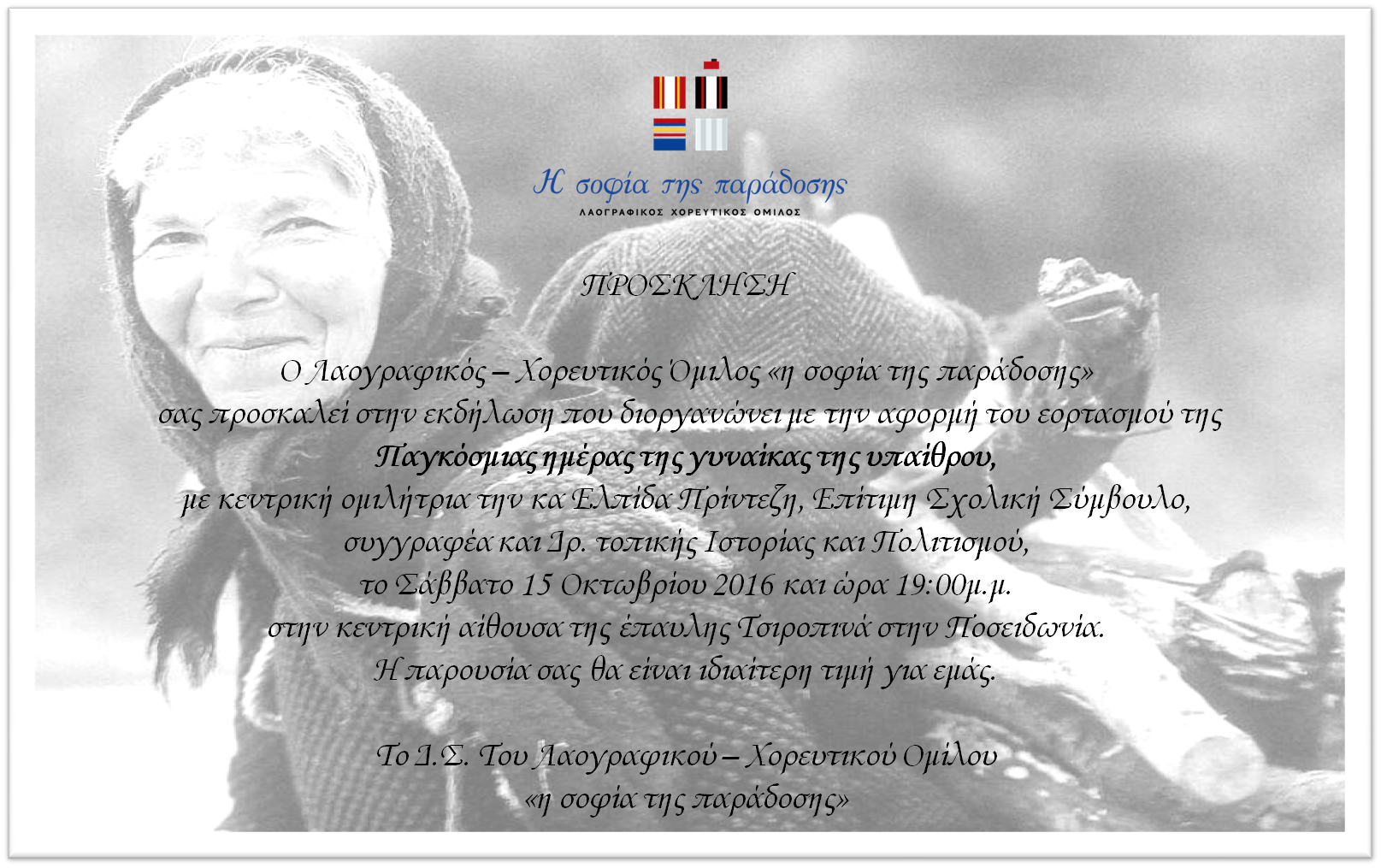 Με αφορμή την ημέρα εορτασμού της Γυναίκας της «Υπαίθρου», η οποία έχει καθιερωθεί από το Παγκόσμιο Ίδρυμα Κορυφής για τις γυναίκες και εορτάζεται κάθ...