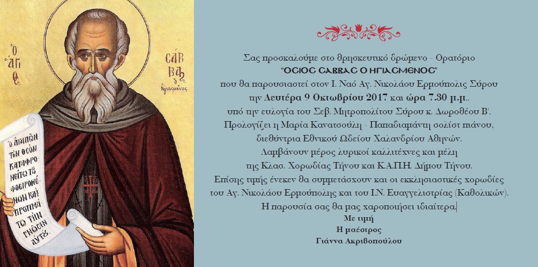 Σας προσκαλούμε στο θρησκευτικό δρώμενο - Ορατόριο ‘‘ΟΣΙΟΣ ΣΑΒΒΑΣ Ο ΗΓΙΑΣΜΕΝΟΣ” που θα παρουσιαστεί στον Ι. Ναό Αγ. Νικολάου Ερμούπολις Σύρου την Δευτ...