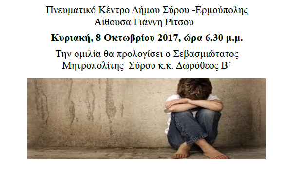 Η Εταιρεία Προστασίας Ανηλίκων Σύρου & η Ιερά Μητρόπολη Σύρου σας προσκαλούν στην ομιλία του Παν. Αρχιμ. Μελέτιου Ζαχαρόπουλου, Οικογενειακού Ψυχοθερα...