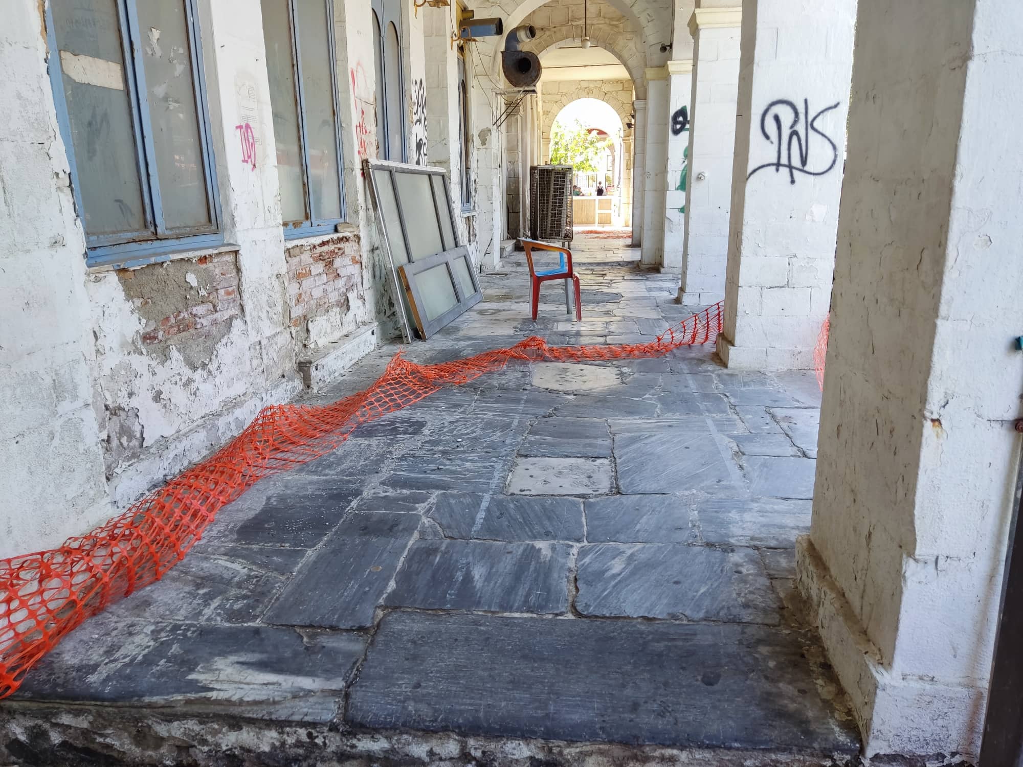 Παντελής απουσία μέριμνας για την επανατοποθέτηση των απαγορευτικών πορτοκαλί πλεγμάτων περιμετρικά του επικίνδυνου κτιρίου του κληροδοτήματος Άννης Κ...