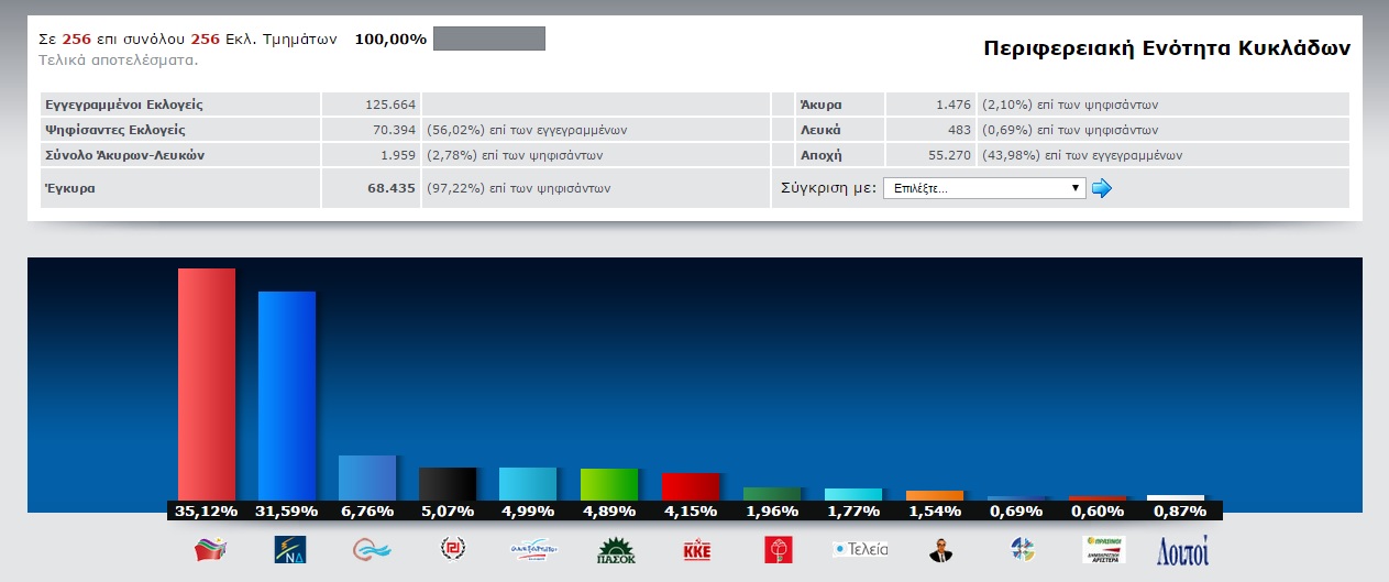 Πρωτιά κατοχύρωσε ο Σύριζα στο νομό των Κυκλάδων με ποσοστό 35,12% έναντι της Νέας Δημοκρατίας που αναδείχθηκε στη δεύτερη θέση με 3,53 ποσοστιαίες μο...