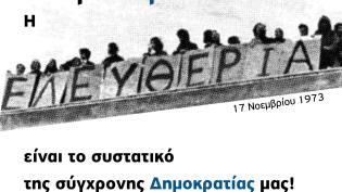 Το "Πολυτεχνείο" αποτελεί σύμβολο των αγώνων για δημοκρατία, ελευθερία, ισονομία, Παιδεία ,κοινωνική δικαιοσύνη και αξιοπρεπή διαβίωση όλων, εξυψώνον...