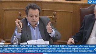 O Αναπληρωτής Υπουργός Ναυτιλίας και Νησιωτικής Πολιτικής, Νεκτάριος Σαντορινιός κατά την ομιλία του στη Διαρκή Επιτροπή Παραγωγής και Εμπορίου του σχ...