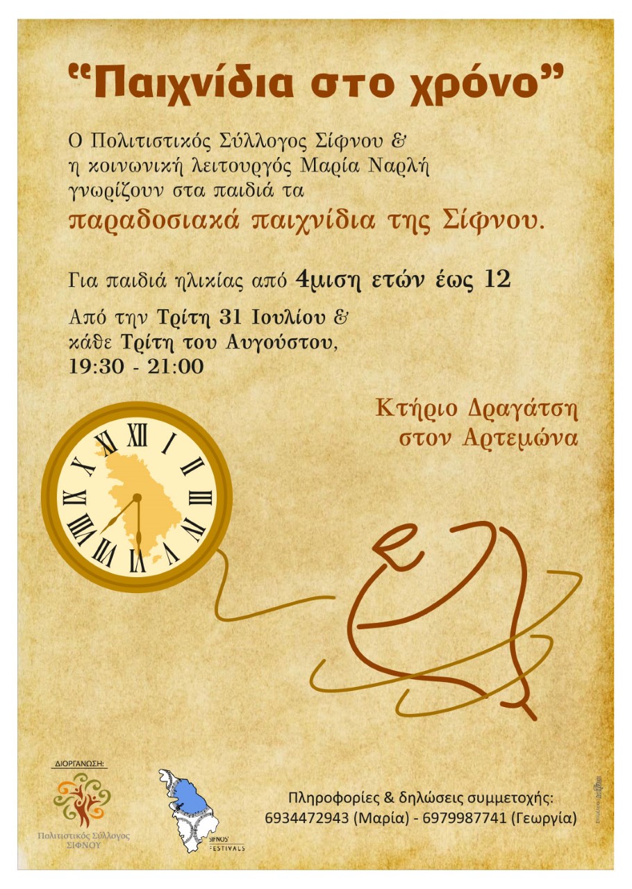 Ο Πολιτιστικός Σύλλογος Σίφνου & η κοινωνική λειτουργός Μαρία Ναρλή γνωρίζουν στα παιδιά τα παραδοσιακά παιχνίδια της Σίφνου. Για παιδιά ηλικία...