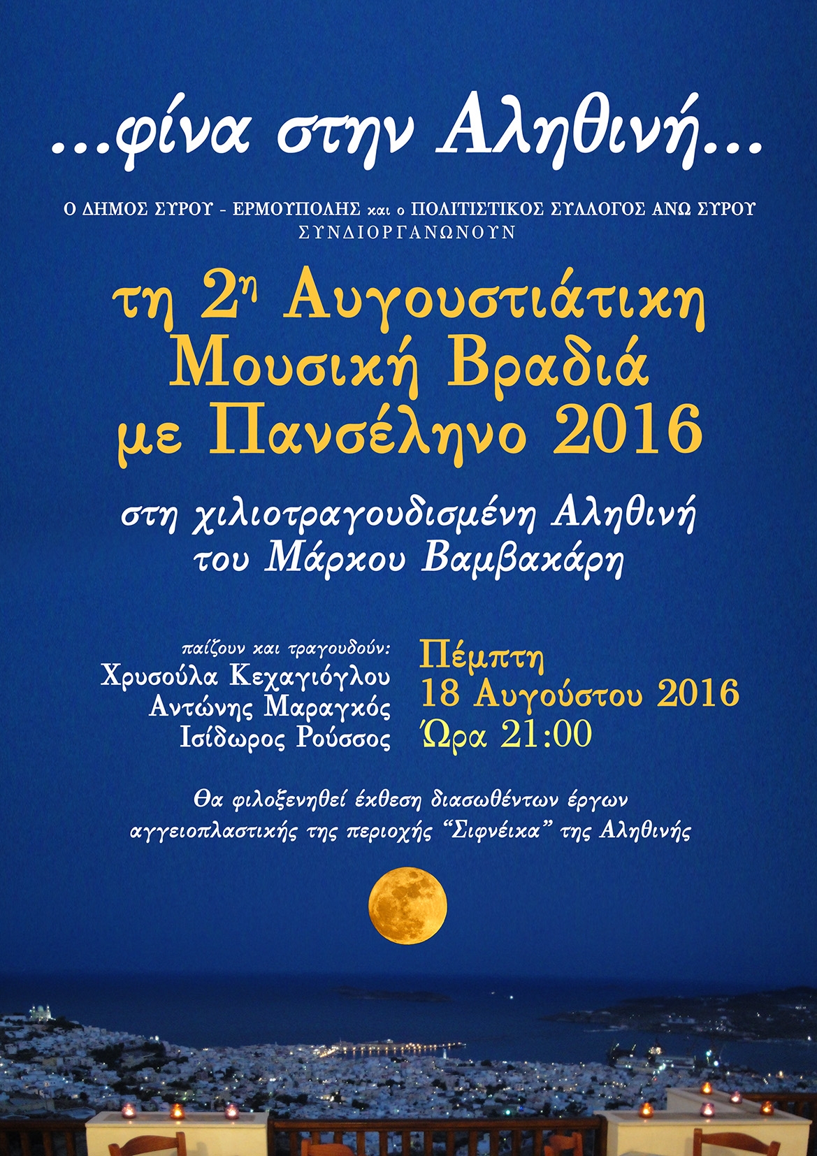 Στο πλαίσιο των πολιτιστικών εκδηλώσεων του Δήμου Σύρου – Ερμούπολης «Σύρος – Πολιτισμός 2016», o Πολιτιστικός Σύλλογος Άνω Σύρου και ο Δήμος Σύρου – ...