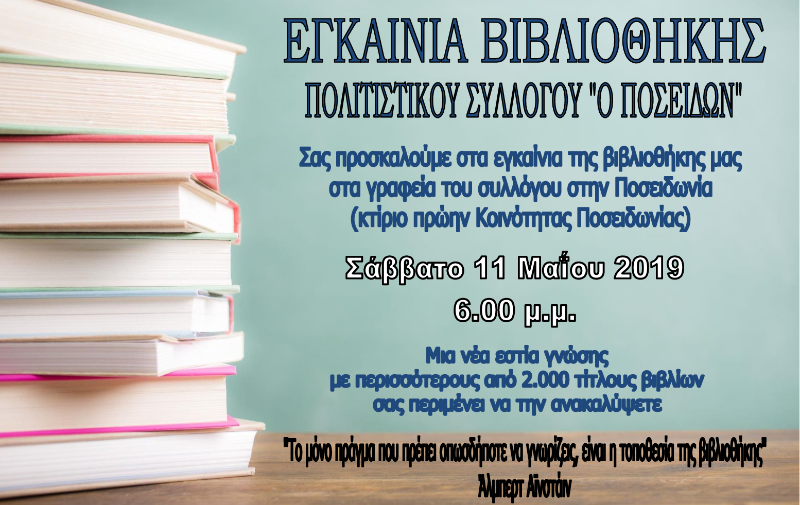 Σας προσκαλούμε στα εγκαίνια της βιβλιοθήκης του Πολιτιστικού Συλλόγου “Ο Ποσειδών”, που θα πραγματοποιηθούν το Σάββατο 11 Μαΐου 2019 και ώρα 6.00 μ.μ...