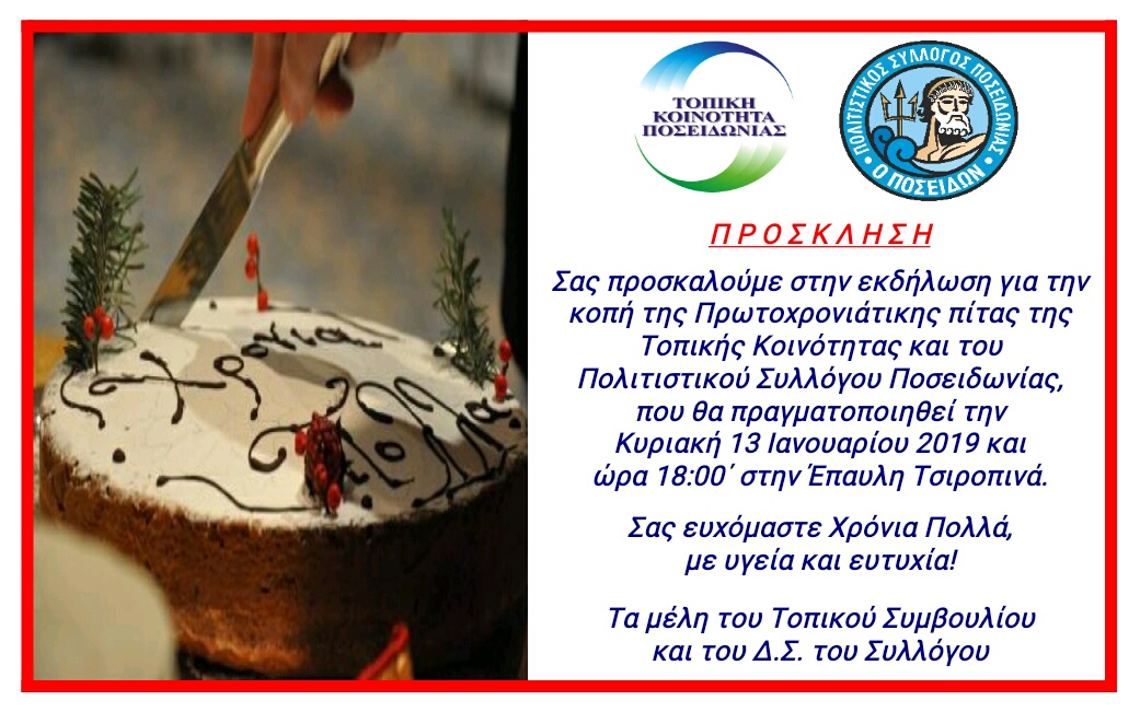 Την πρωτοχρονιάτικη πίτα του κόβει ο Πολιτιστικός Σύλλογος Ποσειδωνίας, στην Έπαυλη Τσιροπινά, την Κυριακή 13 Ιανουαρίου.