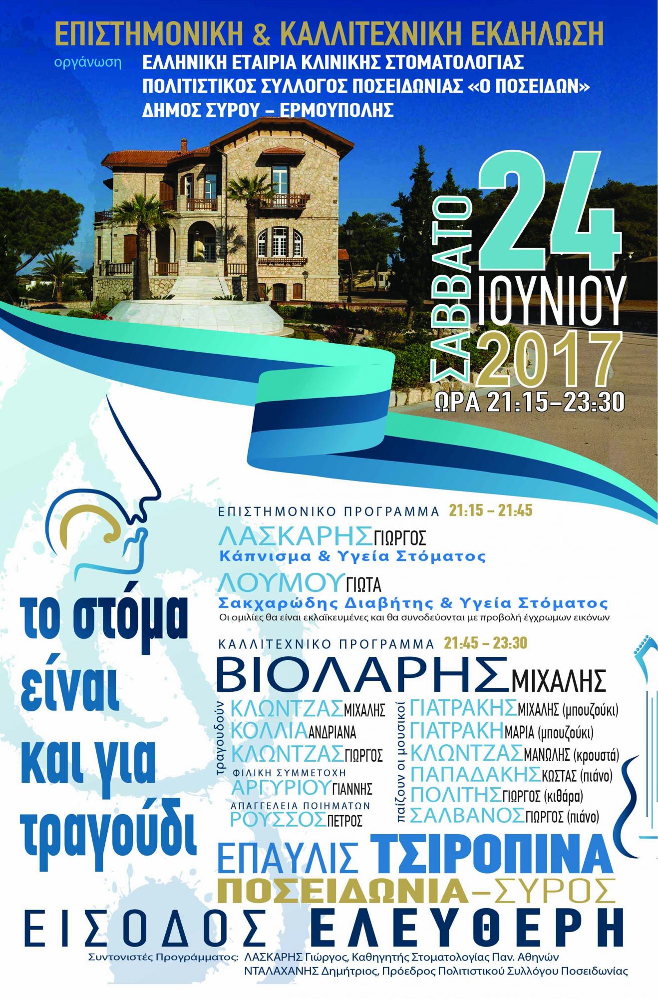 Ο Πολιτιστικός Σύλλογος Ποσειδωνίας “Ο Ποσειδών” στα πλαίσια των παράλληλων εκδηλώσεων του “Σύρος-Πολιτισμός 2017” σας προσκαλεί το Σάββατο 8 Ιουλίου ...