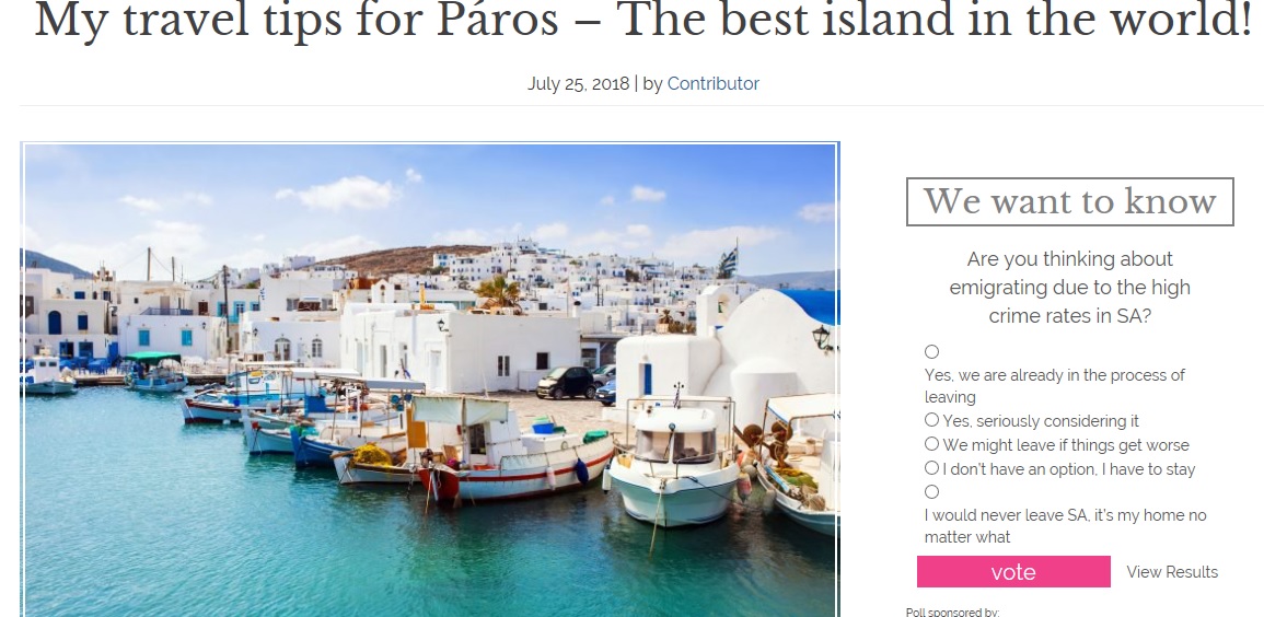 Με τίτλο: «My travel tips for Paros – The best island in the world!» η ηλεκτρονική έκδοση του ταξιδιωτικού οδηγού της Νότιας Αφρικής «ALL4WOMEN» παρου...