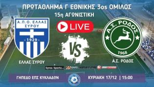 Παρακολουθήστε σε ζωντανή μετάδοση από το γήπεδο της ΕΠΣ Κυκλάδων στην Ερμούπολη την αναμέτρηση της 15ης αγωνιστικής του 3ου ομίλου της Γ' Εθνικής μετ...