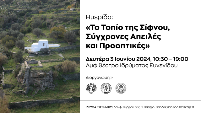Μία σημαντική ημερίδα με θέμα: “Το Τοπίο της Σίφνου, Σύγχρονες Απειλές και Προοπτικές”, συνδιοργανώνει το Ίδρυμα Ευγενίδου, με τη Σχολή Αρχιτεκτόνων Μ...
