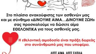 Στο πλαίσιο ανακούφισης των ασθενών μας και με σύνθημα "Δίνουμε αίμα... Δίνουμε ζωή", ο Σύλλογος Καρκινοπαθών & Φίλων Κυκλάδων μας προσκαλεί να προσφέ...