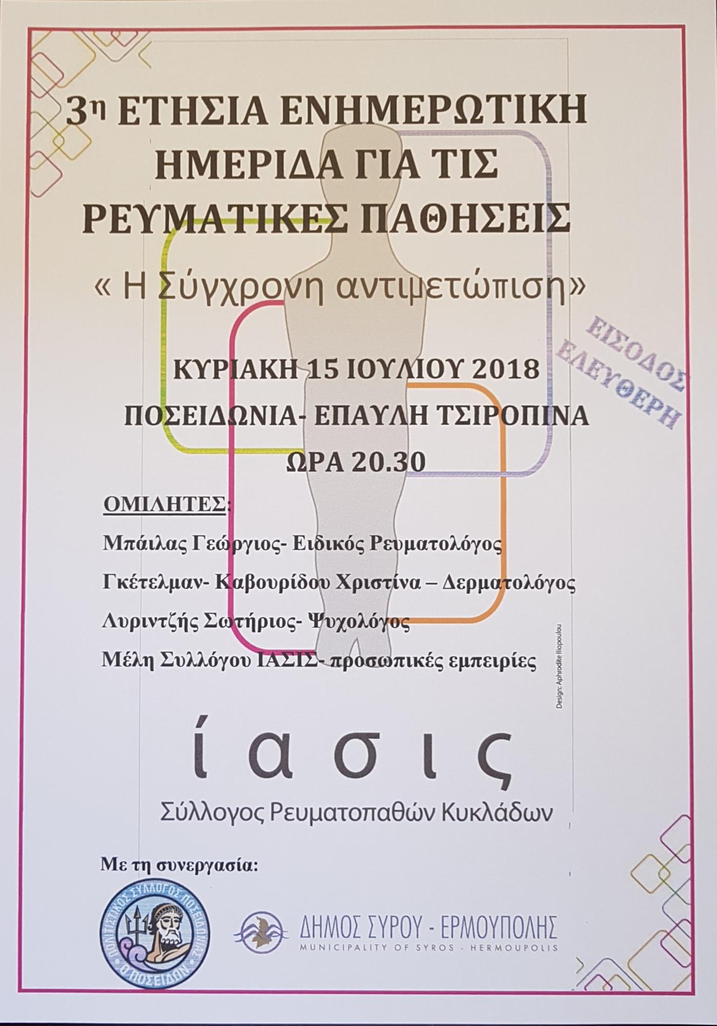 O Σύλλογος Ρευματοπαθών και Φίλων Κυκλάδων «ΙΑΣΙΣ», για τρίτη συνεχόμενη χρονια, σε συνεργασία με την Ελληνική Εταιρεία Αντιρευματικού Αγώνα (ΕΛ.Ε.ΑΝ....