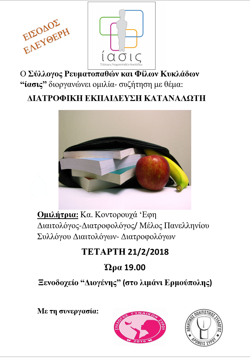 Ο σύλλογος ρευματοπαθών και φίλων Κυκλάδων Ίασις διοργανώνει την 4η ετήσια ενημερωτική ημερίδα για τα ρευματικά νοσήματα . Η εκδήλωση θα πραγματοποιηθ...