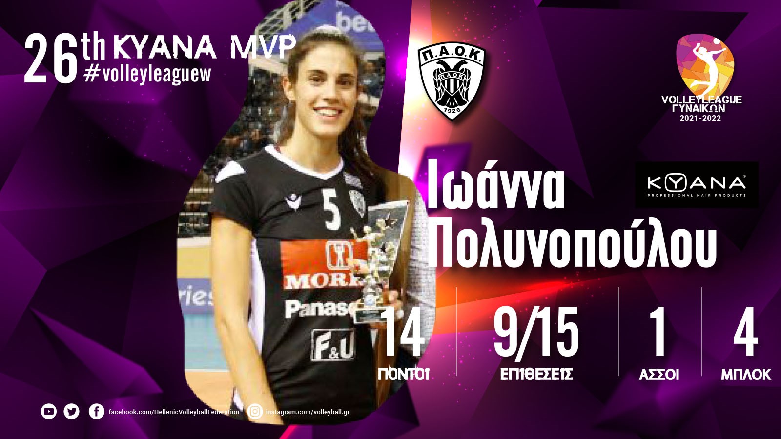 Η Ιωάννα Πολυνοπούλου του ΠΑΟΚ είναι η KYANA MVP της 26ης και τελευταίας αγωνιστικής της Volley League Γυναικών. Η διεθνής κεντρική του Δικεφάλου του...