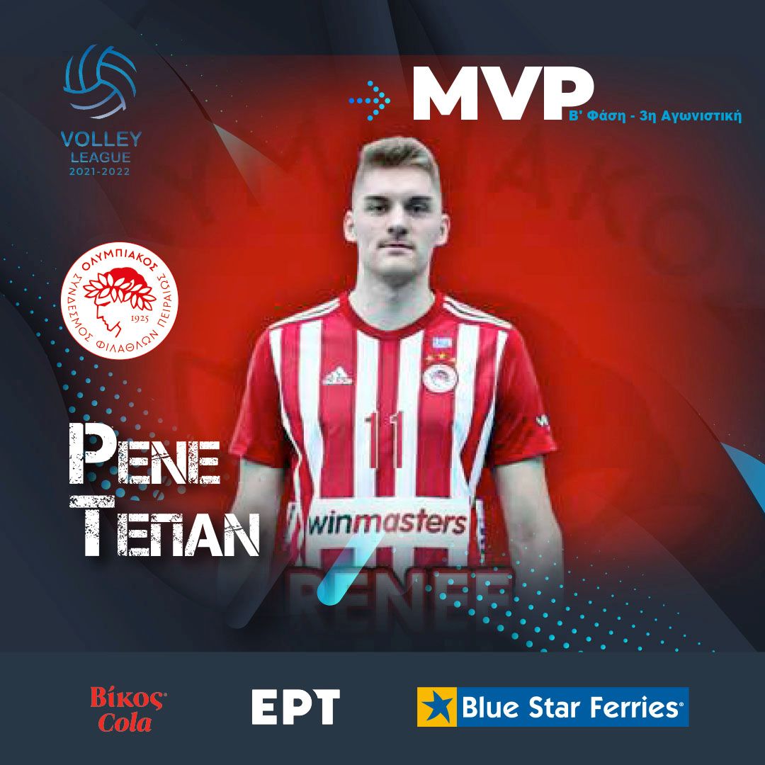 Ο Eσθονός διαγώνιος του Ολυμπιακού Ρενέ Τέπαν αναδείχτηκε MVP Βίκος Cola στην 3η αγωνιστική της B΄ φάσης του πρωταθλήματος Volley League 2021-22: ...