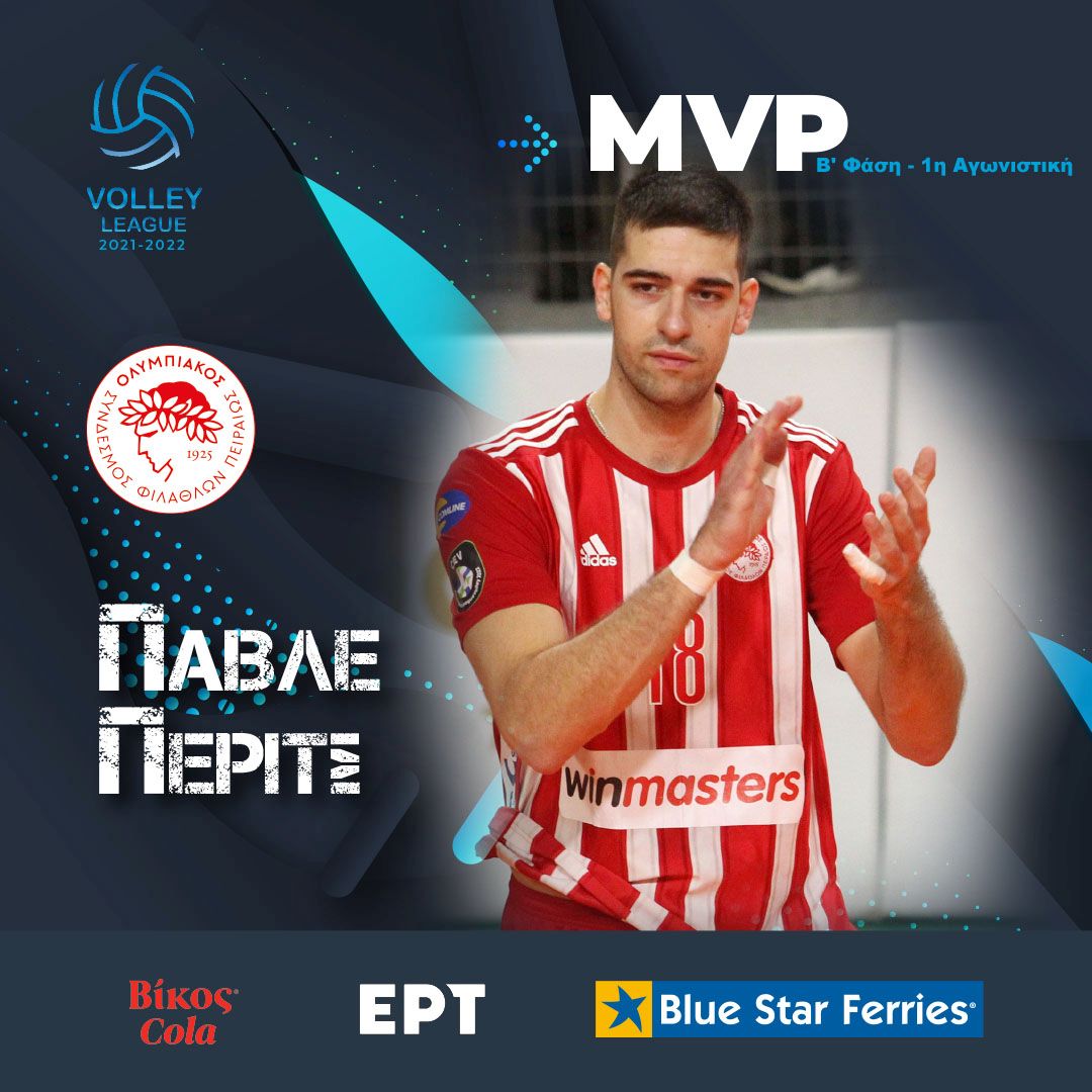 Ο Σέρβος ακραίος του Ολυμπιακού Πάβλε Πέριτς αναδείχτηκε MVP Βίκος Cola στην 1η αγωνιστική της B΄ φάσης του πρωταθλήματος Volley League 2021-22: Ο ...