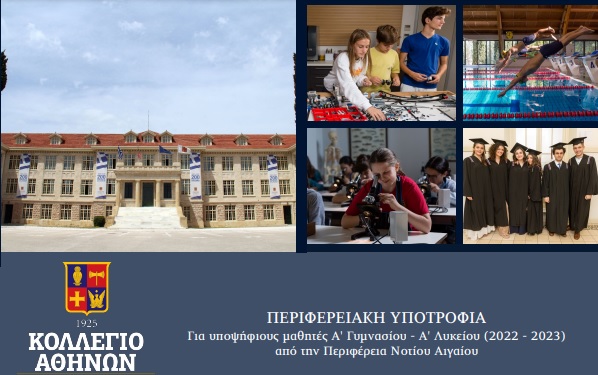 Το Κολλέγιο Αθηνών σε συνεργασία με την Περιφέρεια Νοτίου Αιγαίου έχει θεσπίσει υποτροφία, για μαθητές που συνδυάζουν υψηλές ακαδημαϊκές επιδόσεις με ...