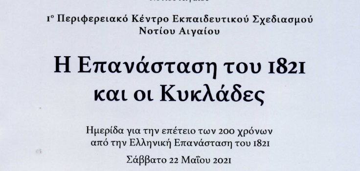 Πρόσκληση για την παρουσίαση του βιβλίου "Η Επανάσταση του 1821 και οι Κυκλάδες", έκδοση του 1ου ΠΕ.Κ.Ε.Σ. Νοτίου Αιγαίου, που θα πραγματοποιηθεί την ...