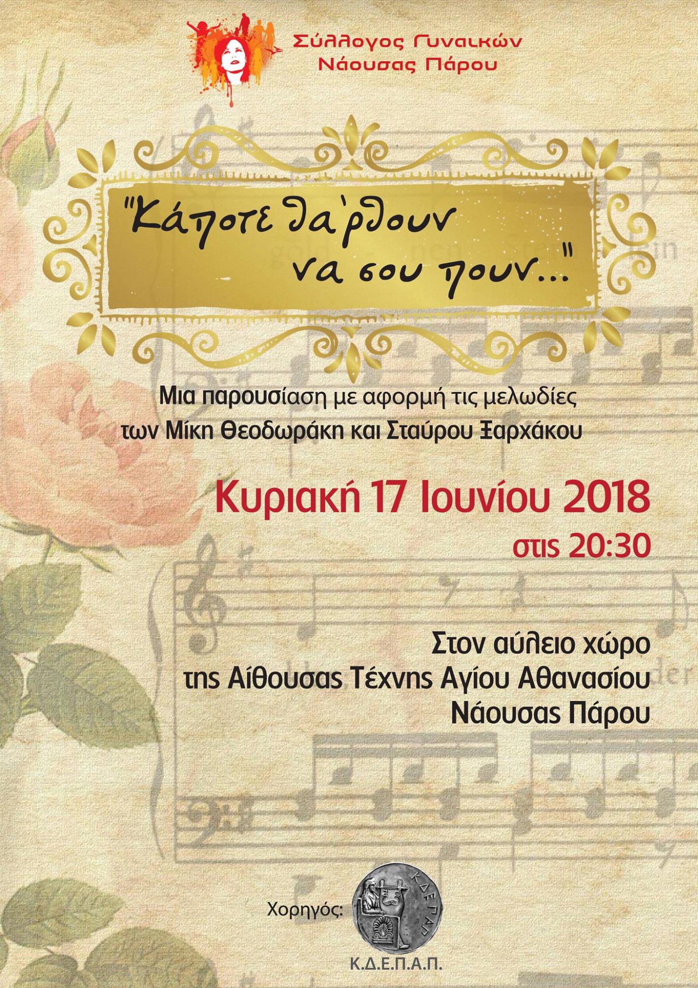 Η χορωδία του Συλλόγου Γυναικών Νάουσας Πάρου θα κάνει μία παρουσίαση με αφορμή τις μελωδίες των Μίκη Θεοδωράκη και Σταύρου Ξαρχάκου με το γενικό τίτλ...