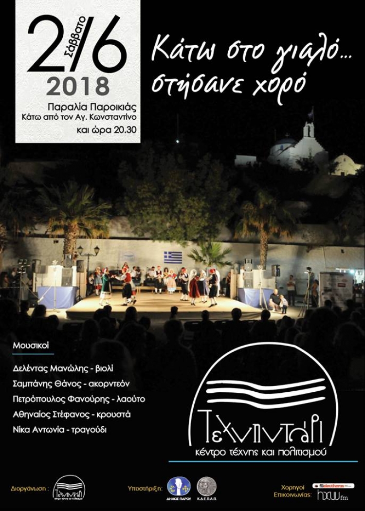 Το Κέντρο Τέχνης και Πολιτισμού "Τεχνηντάρι" διοργανώνει το Σάββατο 2 Ιουνίου 2018 στην παραλία της Παροικιάς κάτω από τον Άγιο Κωνσταντίνο και ώρα 20...