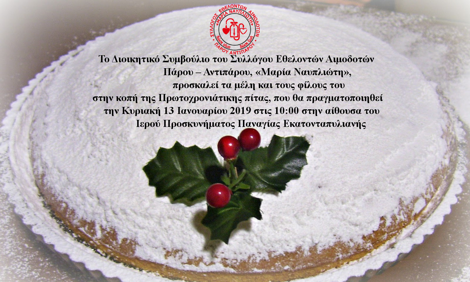 Ο Σύλλογος Εθελοντών Αιμοδοτών Πάρου - Αντιπάρου κόβει την πίτα του την Κυριακή 13 Ιανουαρίου. Δείτε την πρόσκληση.