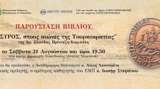 Ο Πολιτιστικός Σύλλογος Ποσειδωνίας Σύρου προσκαλεί στην παρουσίαση του βιβλίου "Η Σύρος στους αιώνες της Τουρτοκρατίας", της Δρ. Ελπίδας Πρίντεζη - Κ...