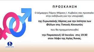 Ο Δήμαρχος Πάρου, κ. Μάρκος Κωβαίος, προσκαλεί κάθε ενδιαφερόμενο, στην εκδήλωση για την υπογραφή της Ευρωπαϊκής Χάρτας για την Ισότητα των Φύλων στις...