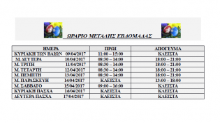 Το ωράριο των καταστημάτων για την περίοδο του Πάσχα, εξέδωσε ο Εμπορικός Σύλλογος Σύρου, για τα μέλη του και προς ενημέρωση των καταναλωτών. Υπενθ...